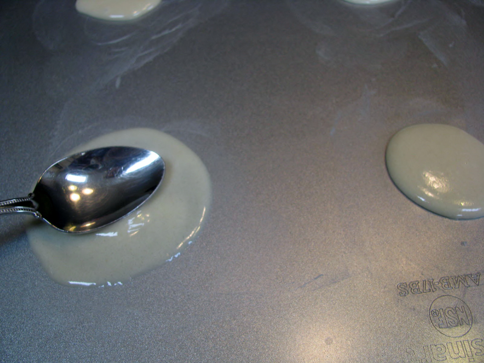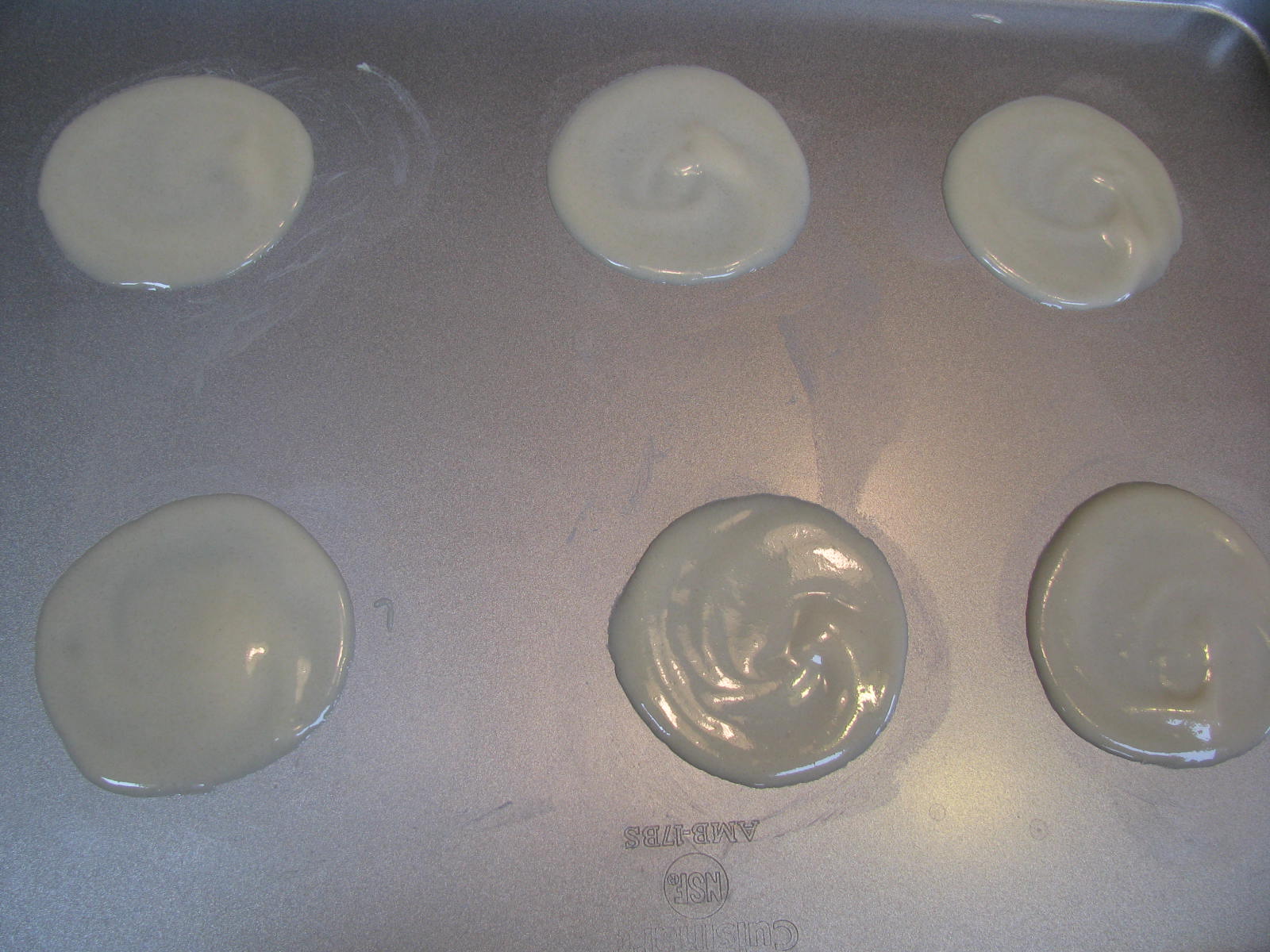 Pour a Tablespoon of batter onto pan and gently spread out with the back of a spoon, using a circular motion. Do not press the spoon through the batter to the pan. Finished circles should be about 3″ in diameter.