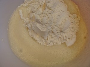 Mix the flour and sugar in with a spoon. The yellow on the right is a shadow, not egg yolk. Do not add the egg yolk, even though mine looks yellow. Someday I will take a photography class and my pictures will be perfect and egg white will look white, not yellow!