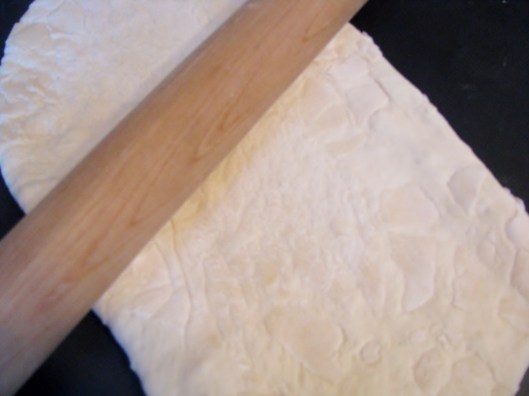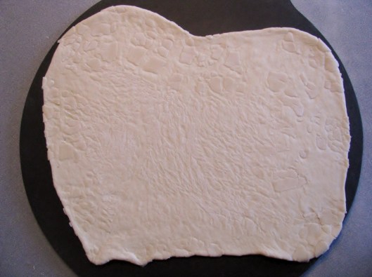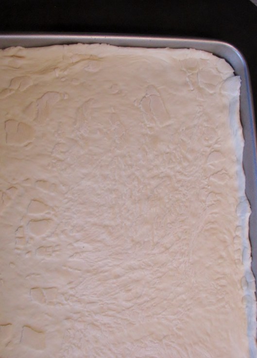 I use a loaf of frozen bread dough, but feel free to make homemade dough, if you prefer. For this recipe, the frozen bread dough works just fine. Let it rise and roll it out, very thin, and in the shape of a rectangle.