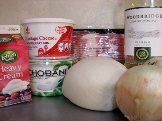 What you may need… You may or may not need the heavy cream, Greek yogurt and cottage cheese, depending what you use as a substitute for fromage blanc (white cheese). Or you may make your own fromage blanc. You also do not need to put wine in it. If you don’t want to cook with the wine, you may want to drink it. The large, unidentifiable lump in the center of the photo is the dough. That you will definitely need (not knead)!