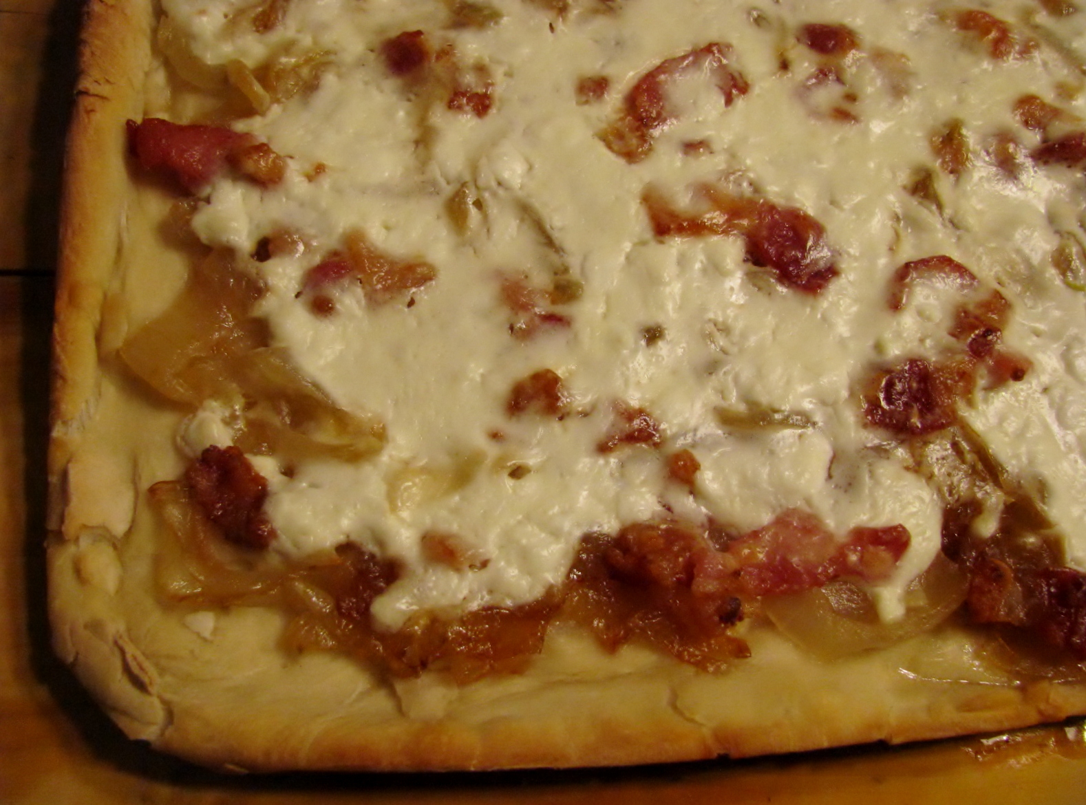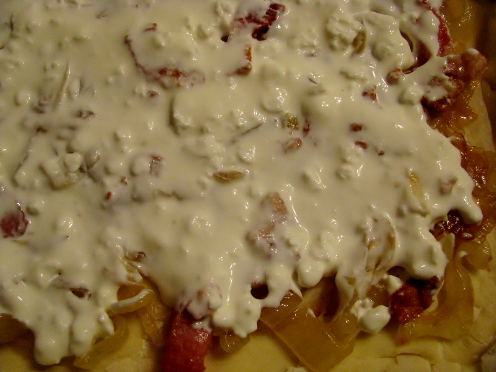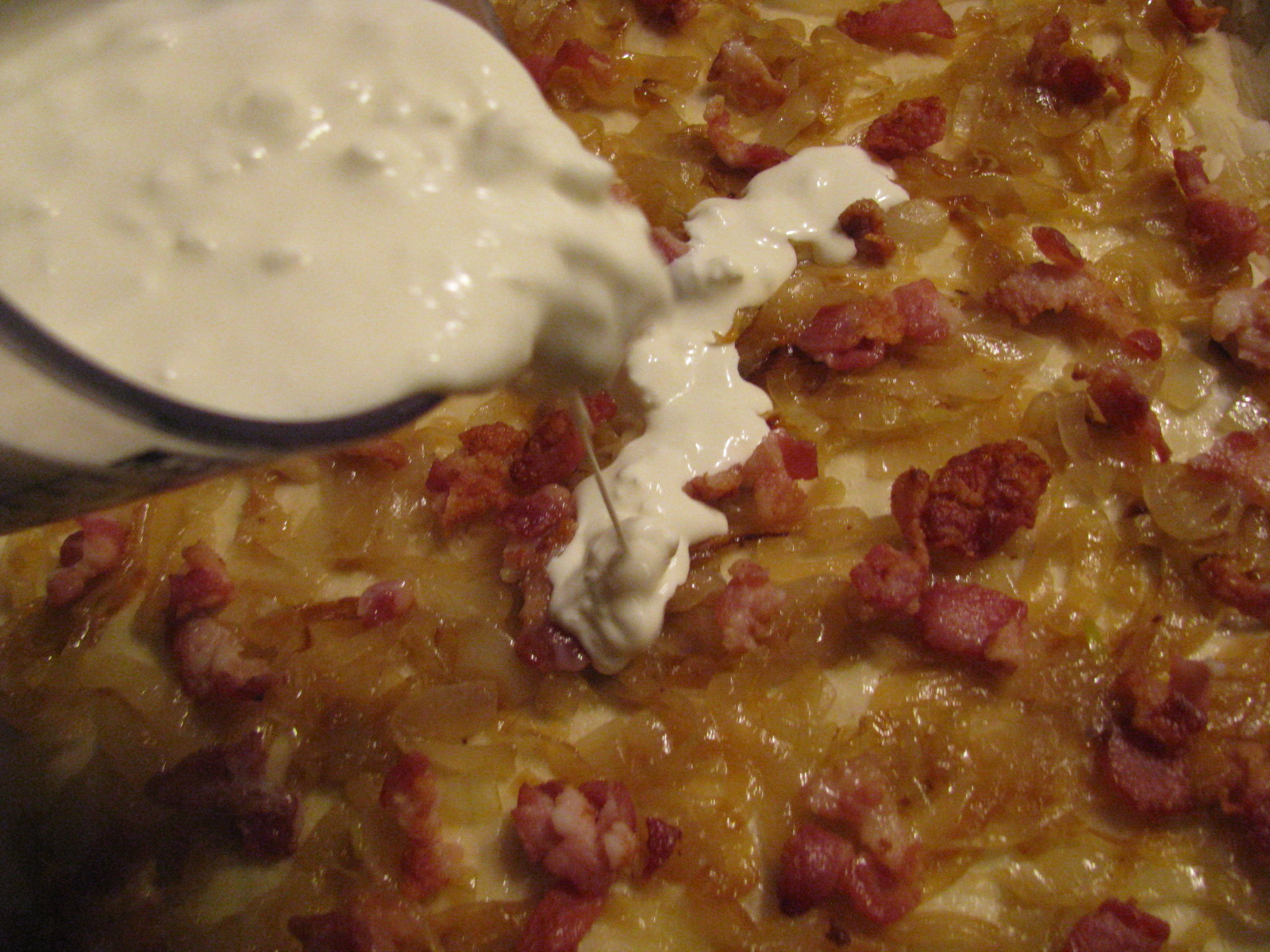 - Spoon cream mixture over the top. (Or, spoon cream mixture over dough. Then add onions and bacon.) Either way works.