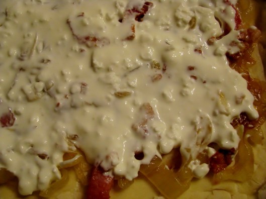 True Confession – I usually put the cream mixture directly on the crust and put the onions and bacon on top, however, with the photographs and distractions, I forgot what I was doing and had to add the cream mixture on top. And it was fine. Yours will be fine, too, either way.