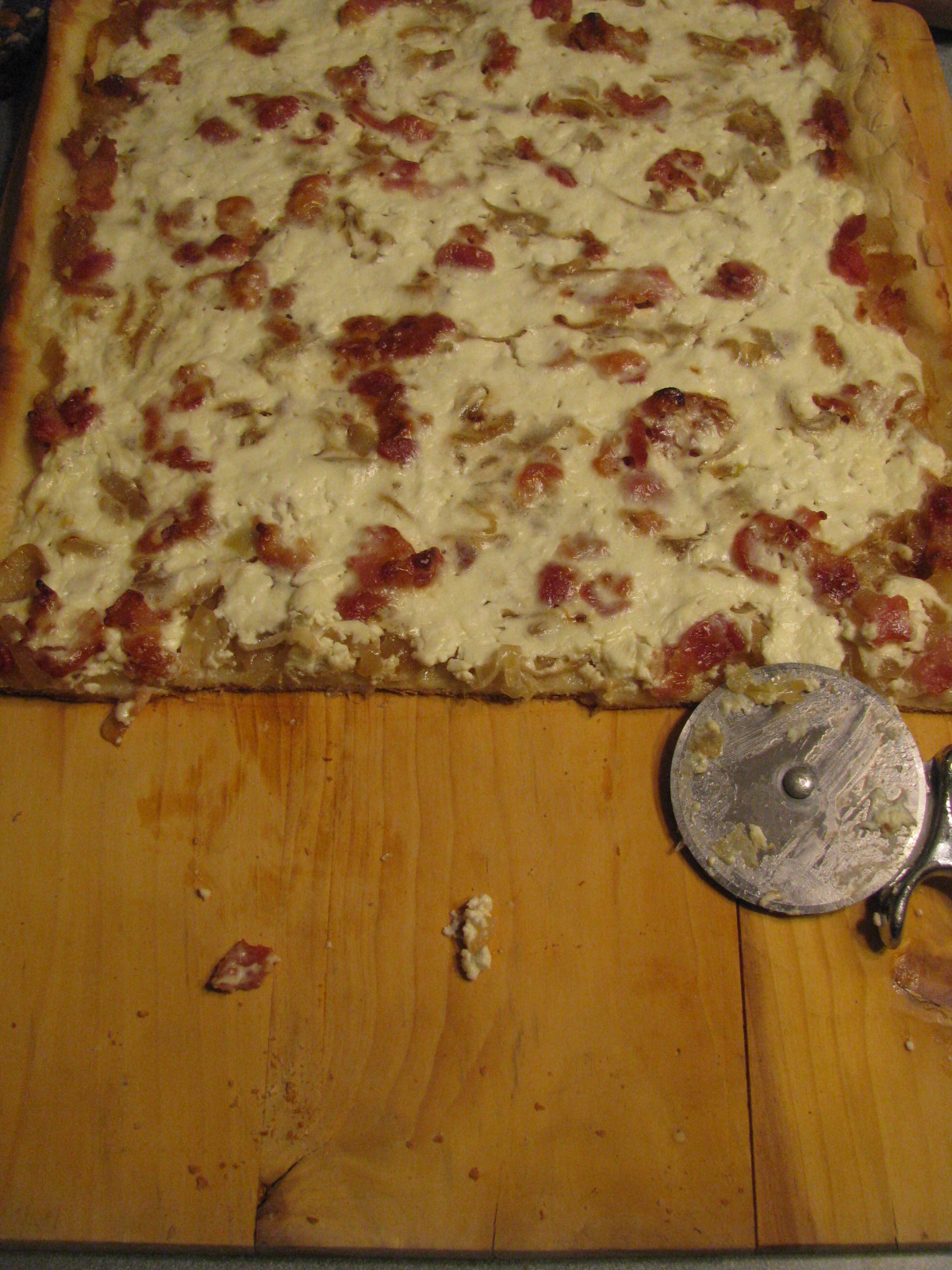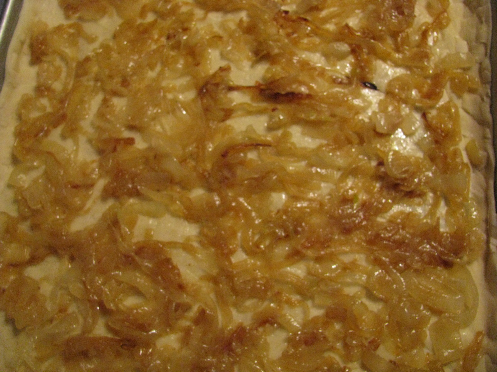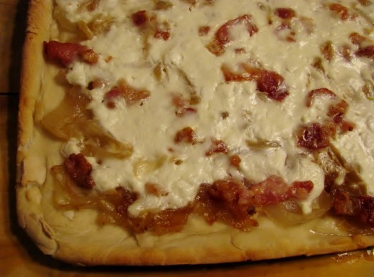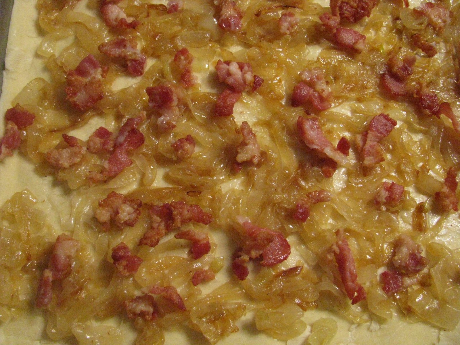 - Spread sautéed onions and bacon on dough.