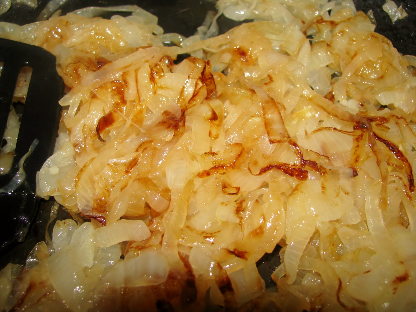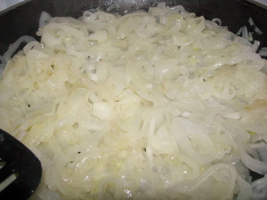 Onions frying in bacon grease and Reisling. The smell is incredible. Mouth-watering. I like to cook them until they are nearly carmelized, however, you can use them raw, carmelized or anywhere in between.