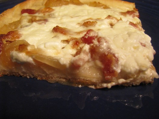 Can you see the crisp crust, the sweet onions, the salty bacon, and the mild, melted cheese? Each bite is a savory symphony in your mouth. This is my first piece.