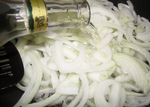 The onions are sweet but I like to add a little bit of sweet, white wine. A Reisling is perfect – it complements the sweet flavor of the onions.