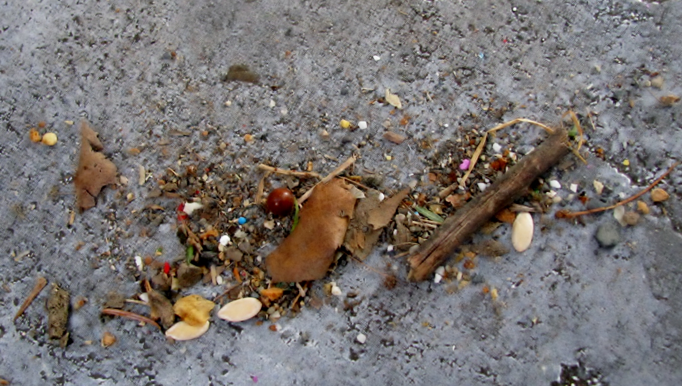 Debris on the kitchen floor – three cantaloupe seeds, two little sticks, and pile of dirt from the woods. (Sing to the tune of The Twelve Days of Christmas.)