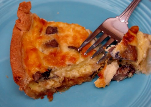 One piece of Mushroom and Onion Quiche (Quiche des champignons et oignons) with Gruyère cheese, which I ate for breakfast. Same recipe as the Bacon and Cheese Tart with mushrooms and onions in place of the bacon. I would do it all again just so I could enjoy this one, delicious piece of leftover quiche for breakfast. Really! The quiche is that good.
