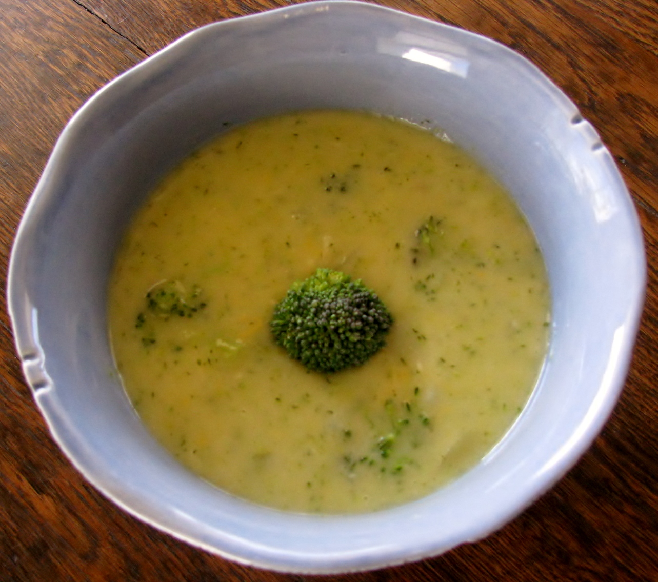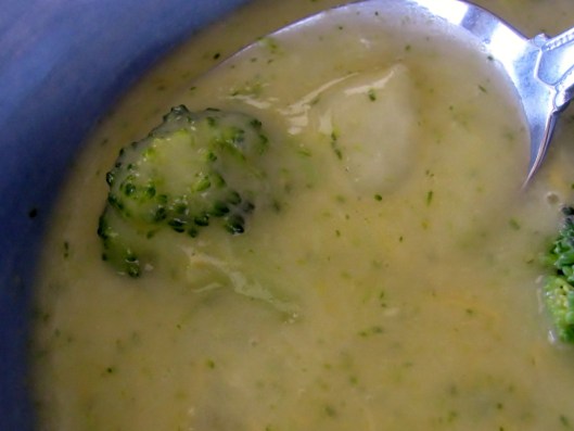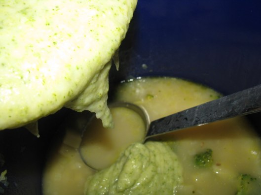 Scoop about half of the potatoes and broccoli out of the soup and place them in a blender or food processor.  Purée.  If you prefer, you can scoop all of the chunks of broccoli and potatoes into the blender to purée.  I prefer to leave about half of the vegetable chunks in my soup.  Partially chunky or all puréed.  Blender or food processor.  It’s your choice.  It’s your soup.  It’s your world.