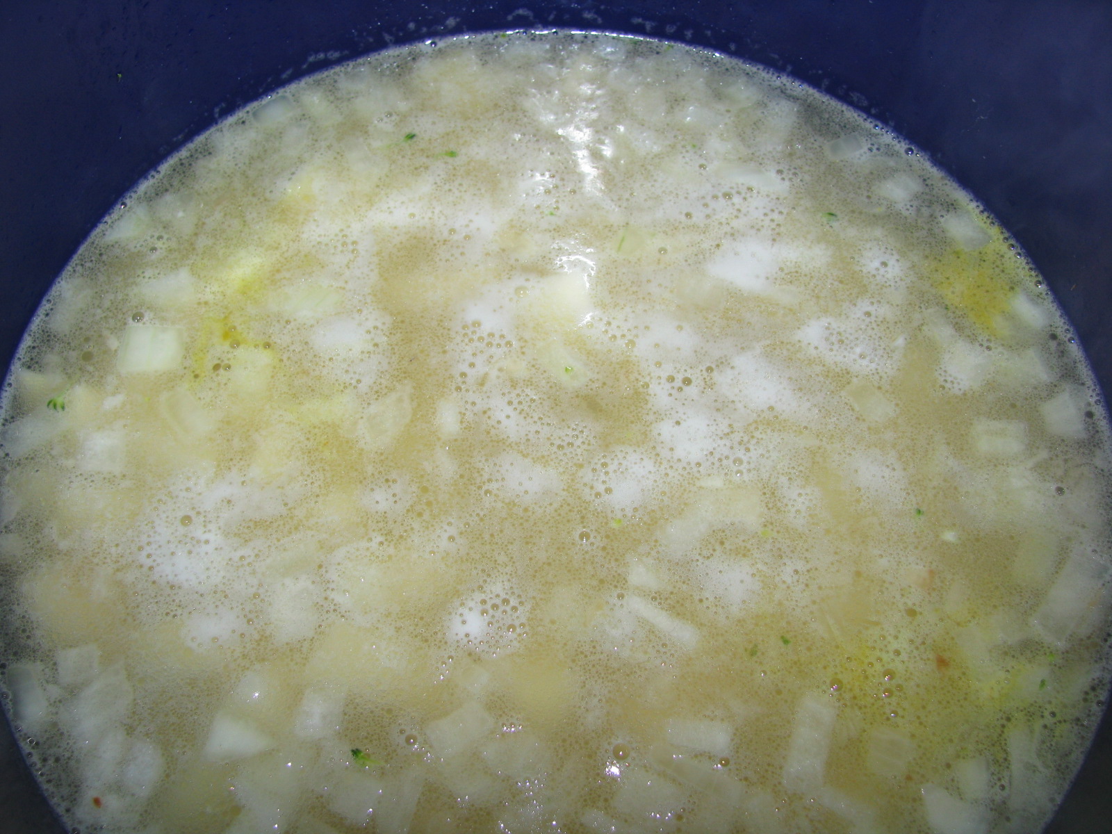The garlic is in there now.  You just can’t see it.  Add the chicken broth.  You may use canned broth, but I prefer to use water and bouillon cubes because I always have them in the pantry.  The bouillon cubes are in the pantry.  Not the water.