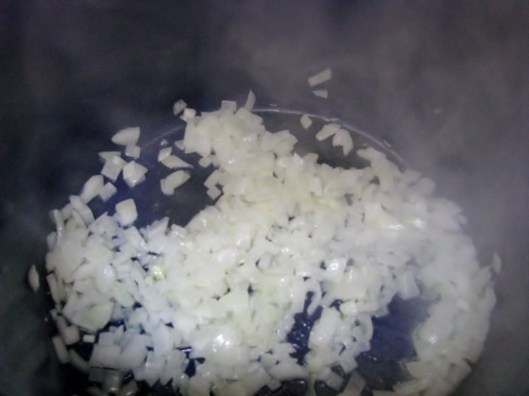 Onions and garlic are cooking.  Please do not zoom in on this picture searching for the garlic.  You won’t find it.  It’s not in there yet.  I forgot to add it until after I took the picture.  Pretend that I don’t like garlic, so I omitted it.  If you don’t like garlic, you can omit it, too.  But I love garlic.  It’s in the next picture.