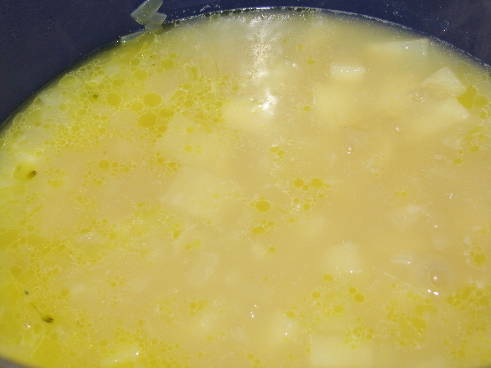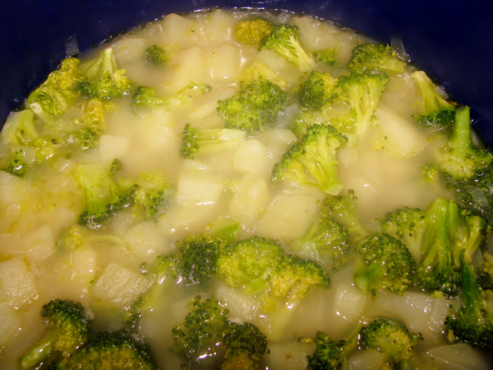 While potatoes are cooking, chop and cook broccoli.  Then add it to the soup.