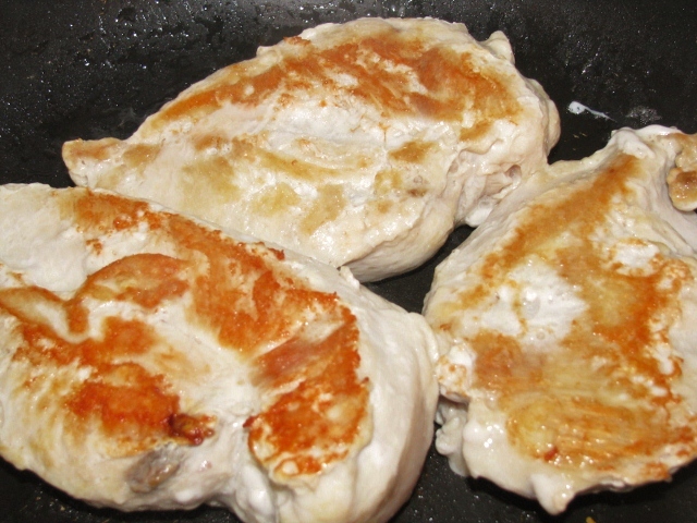 Brown chicken in a little olive oil. Use as much chicken as your family will eat. I used three boneless, skinless chicken breasts. Use dark meat with bones if you prefer it.