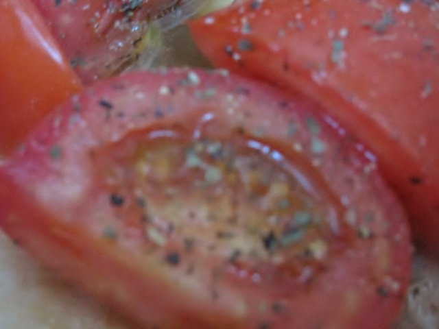 Season with fresh basil, oregano, salt and pepper. If you don’t have fresh herbs, use dried. Fresh is always best. What a silly photo. A blurry close-up of a tomato wedge with herbs, salt and pepper. Either my camera is going or it’s my eyes. And the optometrist appointment was not for me, although maybe it should have been. I prefer to believe it’s a problem with the camera.