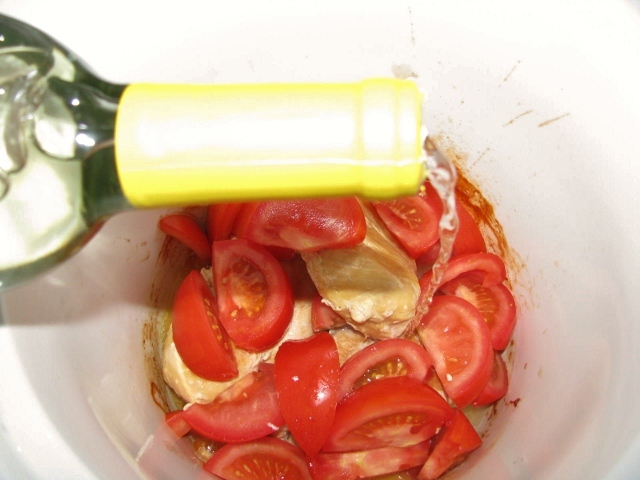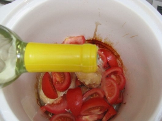 At this point, I would normally continue cooking on top of the stove, simmering the chicken and tomatoes over low heat for 45 minutes. But as I had to be out of the house most of the afternoon, I simply added a cup of chicken broth (1 cup of water and a bouillon cube), some white wine, garlic, and tomatoes and put it in the crock pot on low heat.