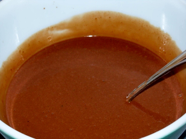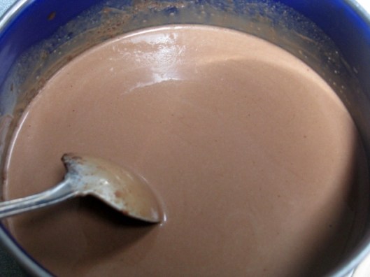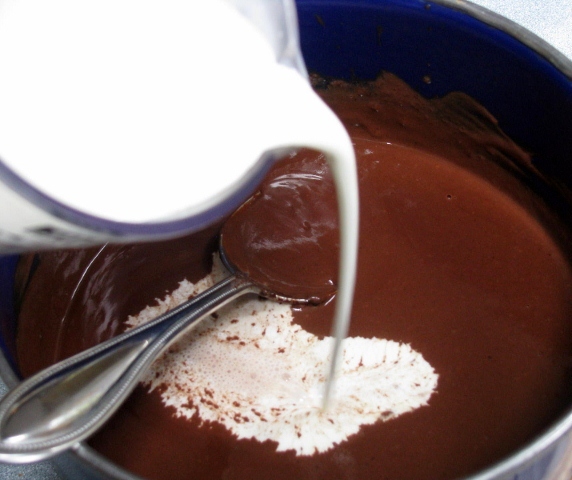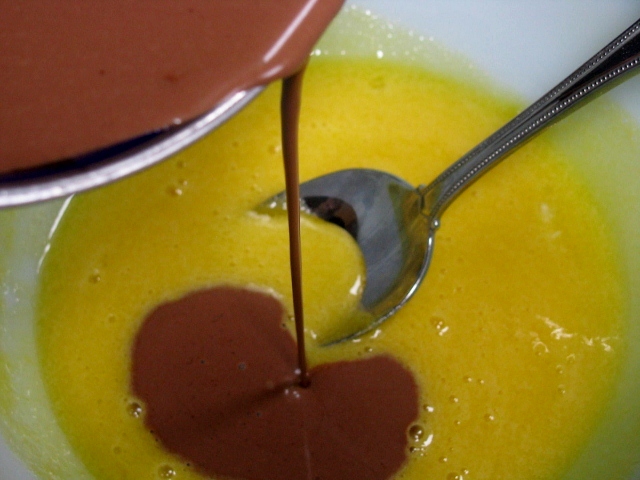- Slowly pour chocolate mixture into egg yolk mixture, stirring constantly.