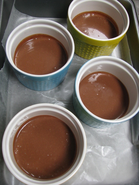 - Divide chocolate cream into six ramekins and place in baking pan.