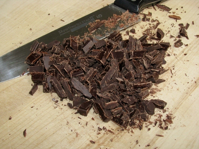 Chop the chocolate. Cutting big chunks of chocolate into tiny pieces. Bittersweet.