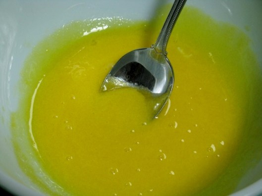 In a medium-sized bowl, gently stir together the egg yolks and the sugar. Do not beat them or make them foamy. Simply stir.