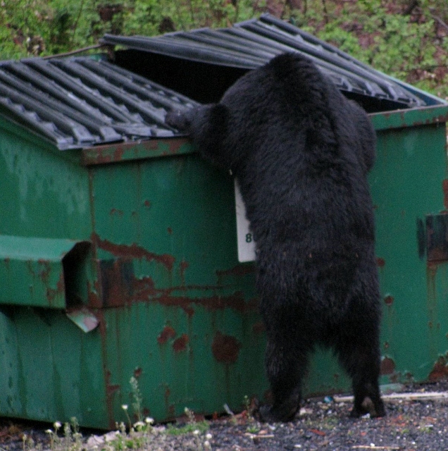 The front of the Dumpster is about five feet high, right at the level of the bear’s armpit.  This is not a cute, little bear cub.  This is Bearzilla!