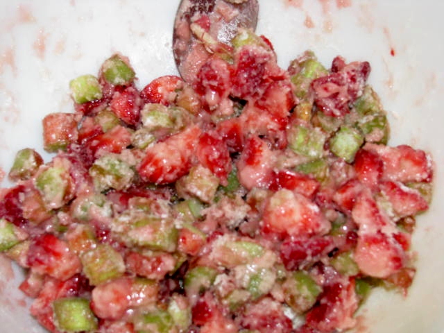 3. Toss rhubarb and strawberries with sugar.