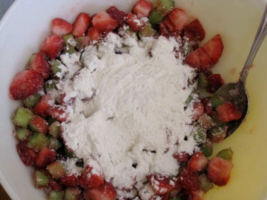 Add the sugar and stir.  The strawberries help to sweeten the pie, but the rhubarb is very tart and sugar is still necessary.  You may vary the quantity to your preference – use more sugar if you like it sweeter, less if you don’t.