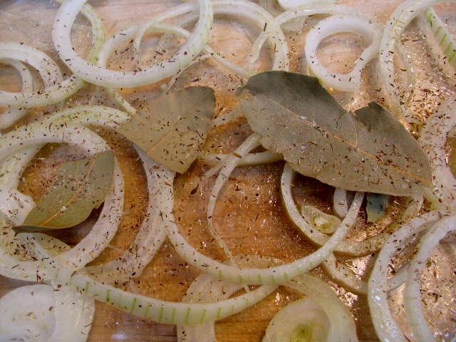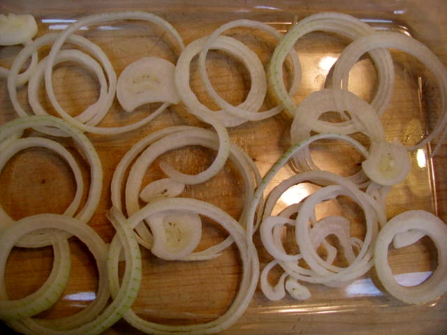 - Layer onions on bottom of baking dish.