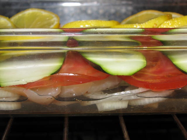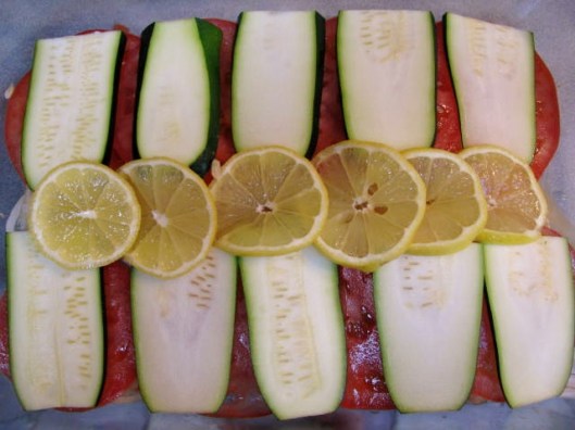 Arrange the vegetables on top of the fish. Put the lemons underneath. Do as I say, not as I do.