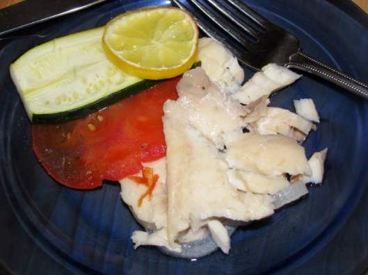 Usually, I put the lemon directly on top of the fish or underneath the fish with the onions, however, to make it look nice in the photo, I put the lemon slices on top of the vegetables. The good news – it looked nice in the photo. The bad news – the lemon overwhelmed the vegetables. The zucchini tasted like lemons. If you use lemons, put them underneath.