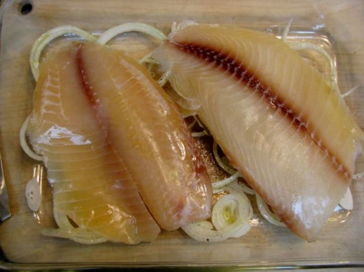 Slice sweet onion and place in bottom of baking dish slightly larger than the fish that you are using.