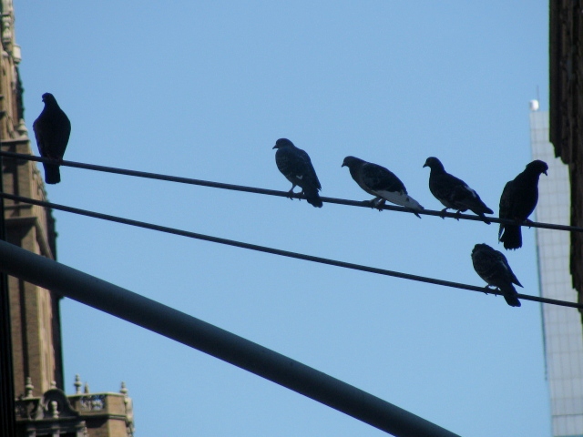 Walking a little further up the street, I noticed these pigeons on a wire. Continuing to look up at them, I almost walked into the side of a cab, the driver honked, and the birds flew away. Fleeting.