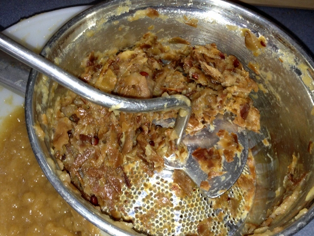 Keep churning and eventually you will be left with the seeds and stems and skins that will not go through the mill. Throw this away and wash the mill immediately. It’s much easier to clean while it’s still moist.