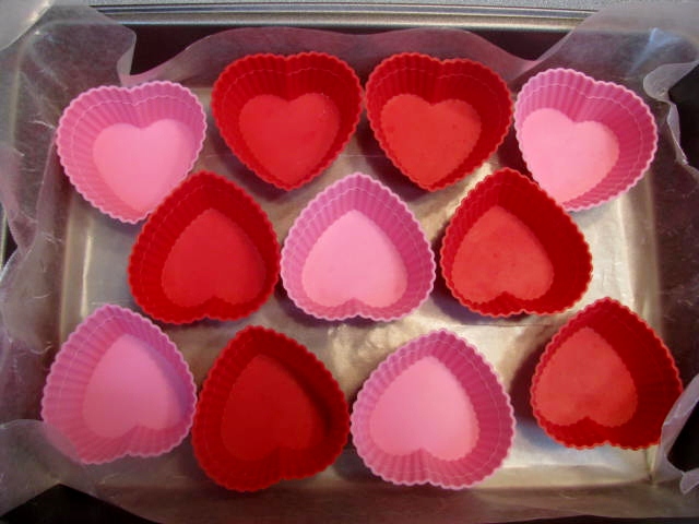 Divide the chocolate cream evenly among twelve heart-shaped cupcake molds. These do not puff up when they bake, so what you see is what you get. If you would like thicker hearts, simply pour more chocolate cream in each heart mold and make six instead of 12. Again, they are small, but very rich.
